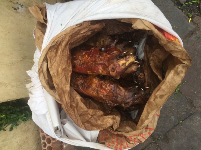 Il paraît que le goût du Cuy rappelle celui du lapin, et l’on m’a également dit poulet. Je n’y ai pas encore goûté et franchement je ne sais pas si j’en mangerai, car, étant donné que j’en ai eu un et qu’ils sont entiers dans l’assiette, j’aurai quand-même un peu de peine, même si on m’a recommandé le quartier de Tipon où, paraît-il, de nombreux restaurants le servent très bien, en grande quantité et à un prix très raisonnable. A voir…