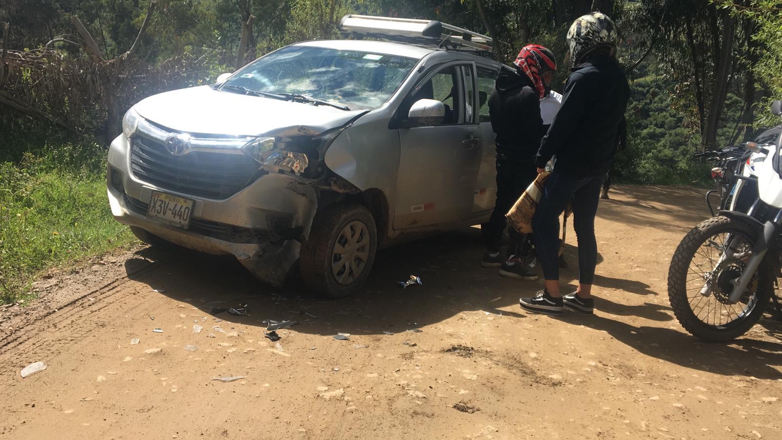 Dans un premier temps, Marco a pu éviter un motard et sa passagère, qui arrivaient vite, dans un virage, mais étaient plus ou moins au bord. Le pilote a klaxonné, et c’est là que nous nous sommes ramassés de plein fouet le motard suivant qui arrivait à fond la caisse, au milieu du chemin, dans un virage sans visibilité. Impossible de l’éviter, d’ailleurs nous étions pratiquement arrêtés. Après l’impact, je me suis immédiatement détachée et ai couru voir si le motard se portait bien. Il n’avait rien… En fait, en freinant à fond, il s’est mis de travers, puis s’est couché avec la moto avant de percuter la voiture, ce qui l’a certainement sauvé.