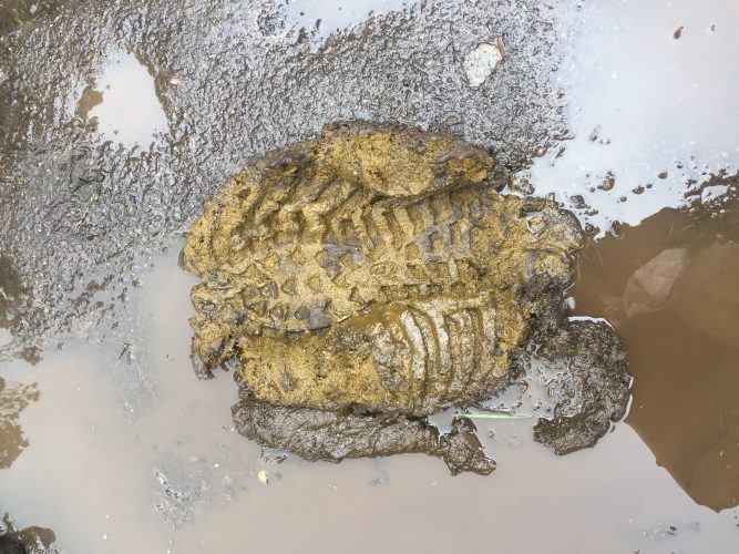 Alors, pour la première des deux photos, une explication s’impose : Steven a crû qu’il marchait sur un caillou, mais, en fait, il a laissé une belle empreinte de sa chaussure dans une magnifique bouse de vache !… ;o))… N’aurait pu mieux faire!… Bon, il paraît que ça porte bonheur, alors…