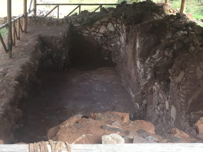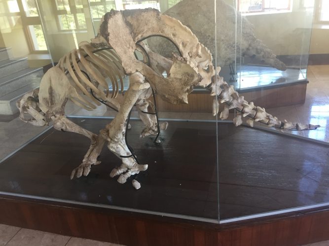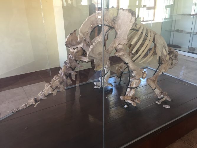 A l’entrée il y a un petit musée avec des pierres turquoises, des céramiques (qui correspondent à l’époque Huari) et deux squelettes de dinosaures découverts lors de fouilles archéologiques.