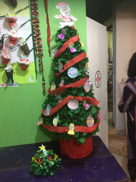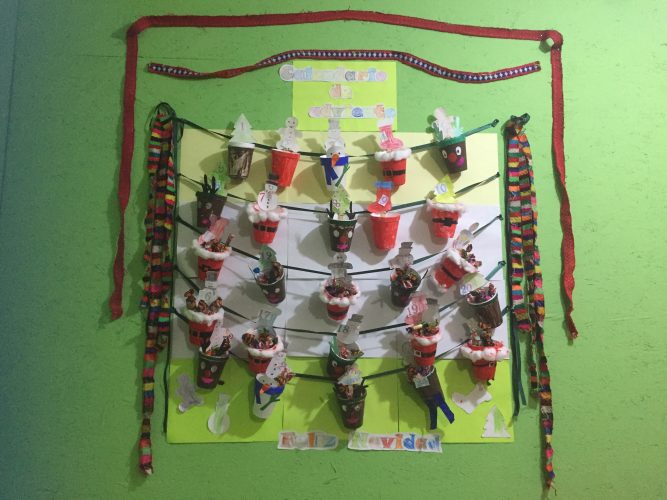 A Noël, mis à part la pièce de théâtre du Principito, Enrique avait également organisé deux activités de bricolages super sympas, le calendrier de l’Avent et le sapin de Noël. Le petit bémol ou la mauvaise idée, d’après moi, c’est d’avoir rempli les gobelets de bonbons. Difficile de gérer, et nous passions notre temps à faire descendre les enfants de la table qui se trouvait sous le calendrier. Inutile de dire qu’au bout de deux jours les gobelets étaient vides. Inévitable !!!…