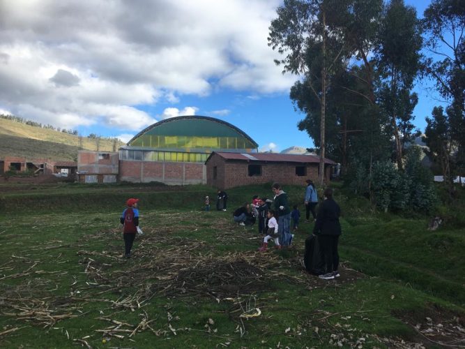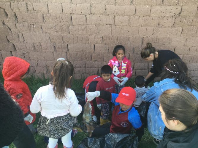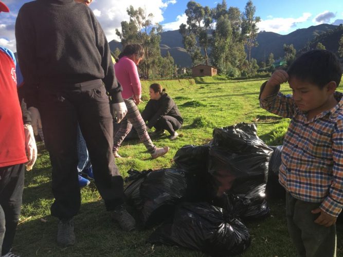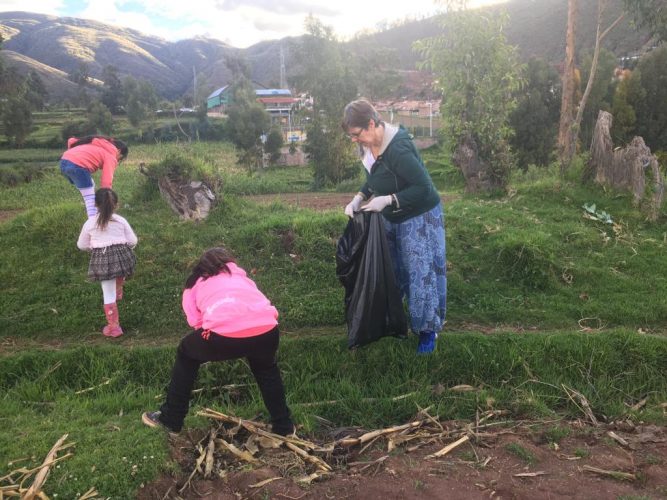 Ce fut la première activité organisée par mes soins. Pour cela j’avais acheté des gants jetables pour petits et grands et nous avons pris les sacs poubelle de Cooperar Perú. Après avoir donné quelques instructions (inutiles car il ne nous ont pas écoutés) aux enfants, style qu’il ne fallait ramasser ni bouteilles cassées, ni boîtes de conserve, ni tout objet coupant, nous sommes partis pour « La Pampa », esplanade de jeu, mais pas seulement, car nous y trouvons régulièrement des vaches ou des moutons attachés à une corde, en train de brouter.