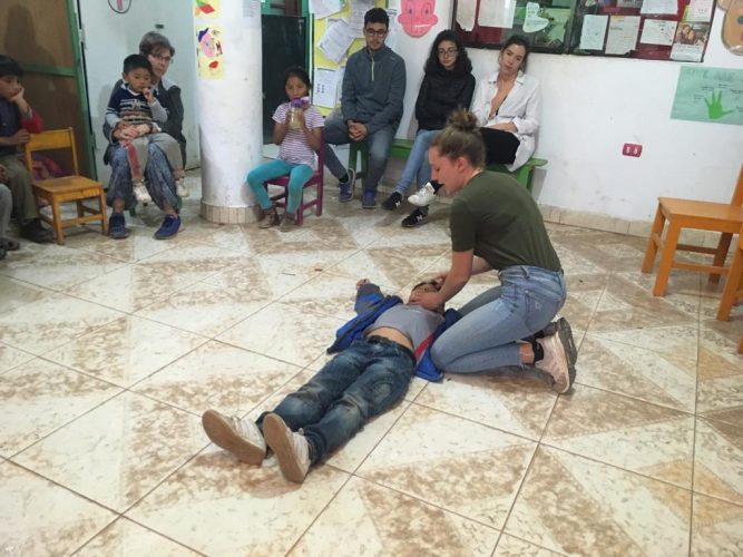 Activité organisée par Margaux, une jeune volontaire, française et pompier professionnel. Le taux de participation des enfants était excellent et ils avaient beaucoup de plaisir à simuler un accident et le sauvetage des blessés.