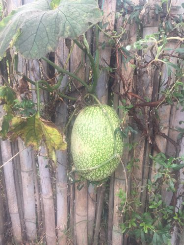Sans oublier les zambos, qui menacent de nous tomber sur la tête à tout moment lorsqu’ils sont mûrs… On les utilise pour nourrir les animaux, mais aussi, lorsqu’il n’est pas trop mûr, dans la soupe, ou, lorsqu’il est mûr, on peut faire des desserts, comme des gâteaux ou des cakes (ce qu’ils ne font jamais ici), et aussi un dessert avec du lait et de la cannelle, mais c’est assez bourratif… Les graines grillées dans une salade sont également excellentes. La chair est blanche mais on pourrait presque les comparer aux courges.